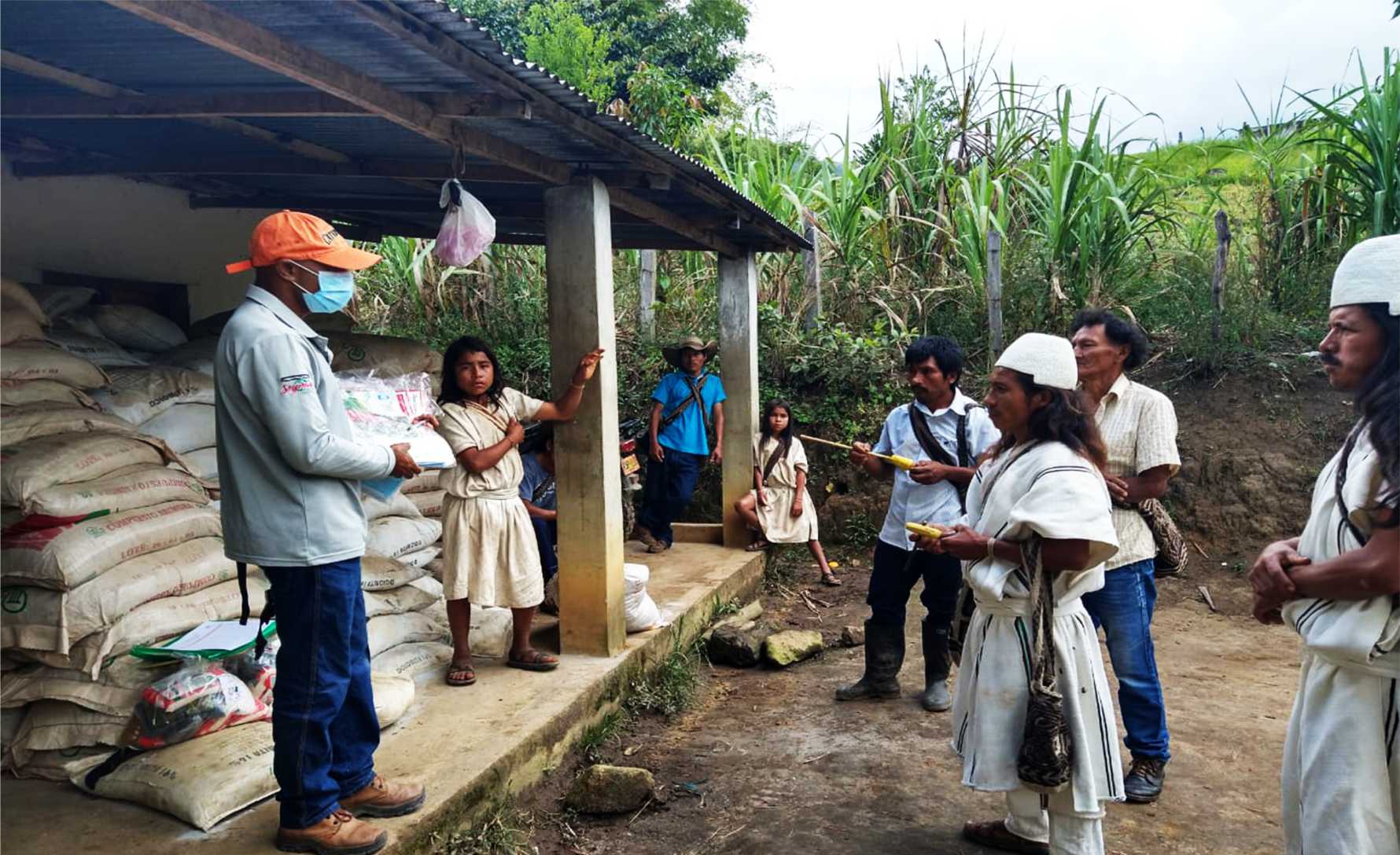 En la implementación de 2 huertas y gallineros para seguridad alimentaria se entregaron : 5 palas, 5 palines, 5 picos, 80 gallinas ponedora de 16 semanas certificadas, 15 bultos de concentrado para gallinas, 5 kit de vitaminas (+) desparasitantes, 5 fracciones de rollo de malla gallinero, 5 insumos gallinero (Comederos, bebederos y nidos), adecuacion de gallinero con techado en Zinc, 3 rollos de malla de angeo, 2 rollos de alambre de púa, 4 regaderas, 2 cajas de grapa para cera, 3 rollos de manguera 1/2, 4 aspersores, 4 azadones, 4 rastrillo y 10 kilos de semillas para las huertas alimentarias. y ademas los diferentes insumos entregados para la parcela demostrativa de café.